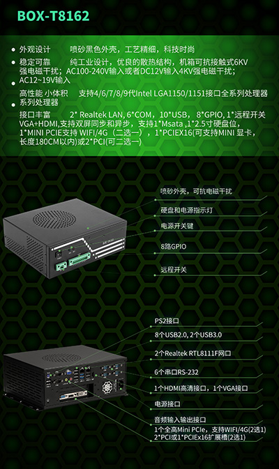 BOX-T8162是一款高性能、小體積、可擴展工控機,桌面式或壁掛式安裝,降低了機箱內(nèi)部噪聲,同時增加了GPU散熱通道。BOX-T8162支持Intel® LGA1150/1151針腳的第4/6/7/8/9代全系列處理器,支持高性能浮點運算,速度最快可以達到128GFLOP/s。支持擴展全高半長的擴展卡,多擴展總線提供良好擴展性能。機箱可抗接觸式6Kv強電磁干擾,整機小巧,功能強大,適用于工業(yè)物聯(lián)網(wǎng)、機器視覺等應(yīng)用。