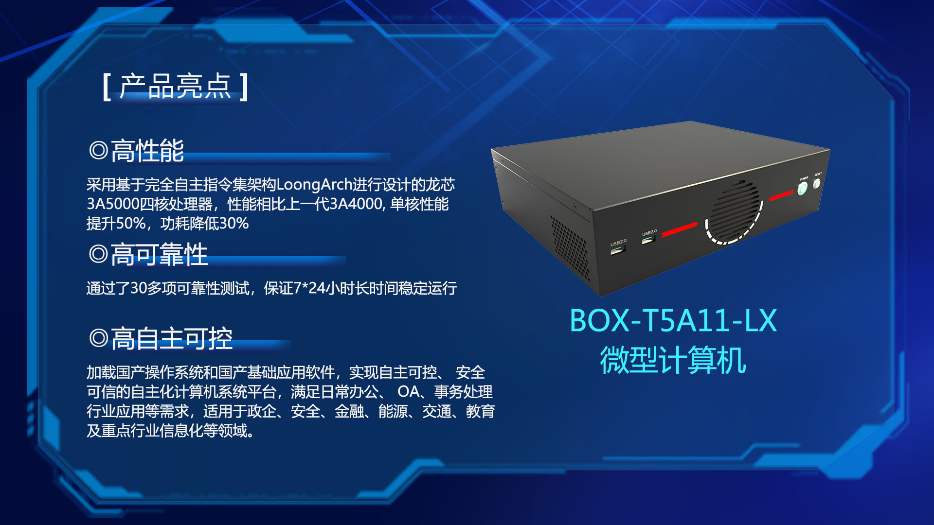 研恒(特控)BOX-T5A11-LX微型計算機采用基于完全自主指令集架構(gòu)LoongArch進行設計的龍芯3A5000四核處理器,性能相比上一代3A4000, 單核性能提升50%,功耗降低30%,指令集系統(tǒng)架構(gòu)承載的軟件生態(tài)走向完全自主。整機采用純工業(yè)設計,通過了30多項可靠性測試,保證設備7*24小時長時間穩(wěn)定運行。配套國產(chǎn)BIOS,加載國產(chǎn)操作系統(tǒng)和國產(chǎn)基礎應用軟件,實現(xiàn)自主可控、 安全可信的自主化計算機系統(tǒng)平臺,滿足日常辦公、 OA、事務處理,行業(yè)應用等需求,適用于政企、安全、金融、能源、交通、教育及重點行業(yè)信息化等領(lǐng)域。
