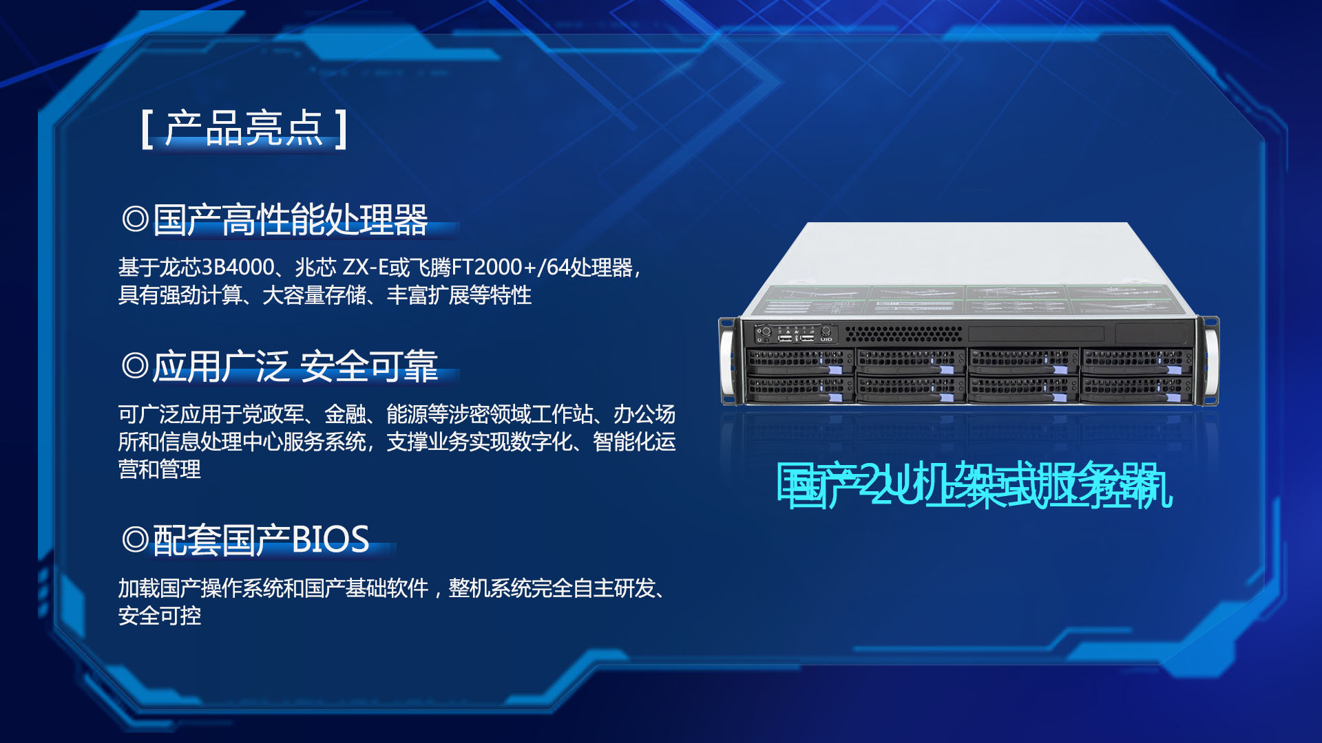 研恒(特控)國產(chǎn)2U機架式服務器基于龍芯3B4000、兆芯 ZX-E或飛騰FT2000+/64處理器,具有強勁計算、大容量存儲、豐富擴展等特性,配套國產(chǎn)BIOS, 加載國產(chǎn)操作系統(tǒng)和國產(chǎn)基礎軟件,整機系統(tǒng)完全自主研發(fā)、安全可控。可廣泛應用于黨政軍、金融、能源等涉密領(lǐng)域工作站、辦公場所和信息處理中心服務系統(tǒng),支撐業(yè)務實現(xiàn)數(shù)字化、智能化運營和管理。