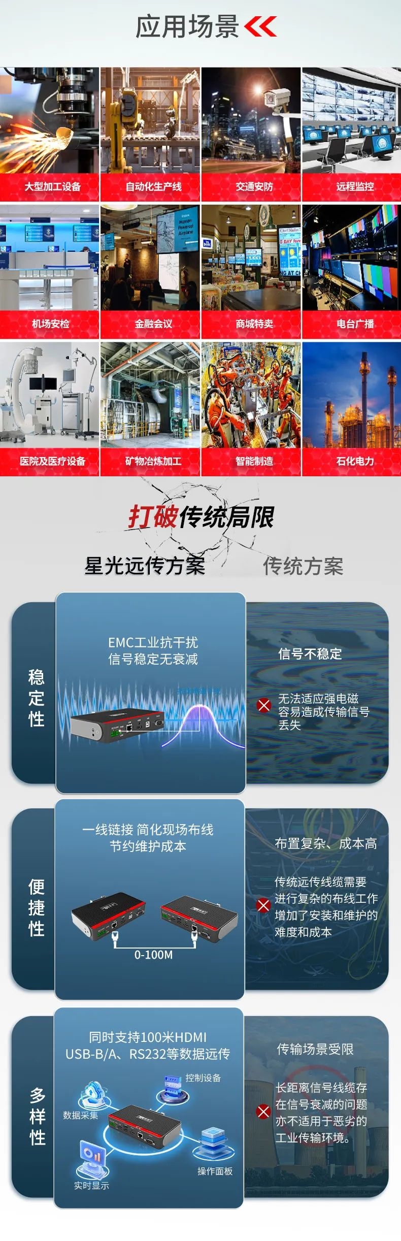 在大型裝備、自動(dòng)化產(chǎn)線、激光及數(shù)控行業(yè)等需要遠(yuǎn)距離信號(hào)傳輸場(chǎng)景中,傳統(tǒng)HDMI線纜存在信號(hào)衰減、傳輸距離限制、布線不便等問(wèn)題,這極大地影響顯示端的成像質(zhì)量和雙向數(shù)據(jù)的穩(wěn)定性和時(shí)效性。為此,特控研發(fā)出抗干擾性強(qiáng)、數(shù)據(jù)零延時(shí)、兼容性強(qiáng)的HDMI星光遠(yuǎn)傳ECU-TR12。特控ECU-TR12采用進(jìn)口高性能芯片設(shè)計(jì),總體由發(fā)射端T12和接收端R12兩部分組成,發(fā)射端可將2.5k高清視頻信號(hào)、USB和RS232數(shù)據(jù)信號(hào)進(jìn)行整合,通過(guò)標(biāo)準(zhǔn)網(wǎng)線(CAT6)遠(yuǎn)距離傳輸?shù)浇邮斩?,無(wú)信號(hào)衰減,接收端通過(guò)高性能智能芯片解碼,可以給用戶高速高質(zhì)量的數(shù)據(jù)及顯示交互體驗(yàn),整機(jī)外殼采用鋁合金散熱設(shè)計(jì),機(jī)身堅(jiān)固小巧獨(dú)具工業(yè)美感,可搭配行業(yè)通用HDBeasT協(xié)議設(shè)備使用,包括內(nèi)置協(xié)議的HMI操作端、工業(yè)顯示平板、工業(yè)PC及終端采集設(shè)備。